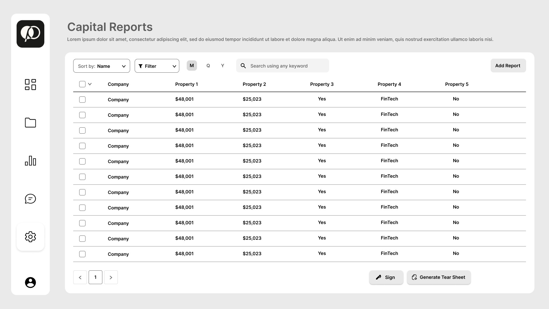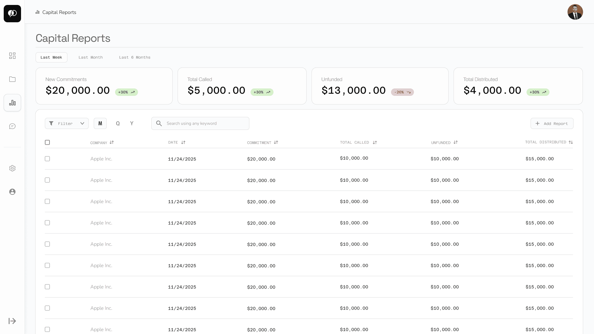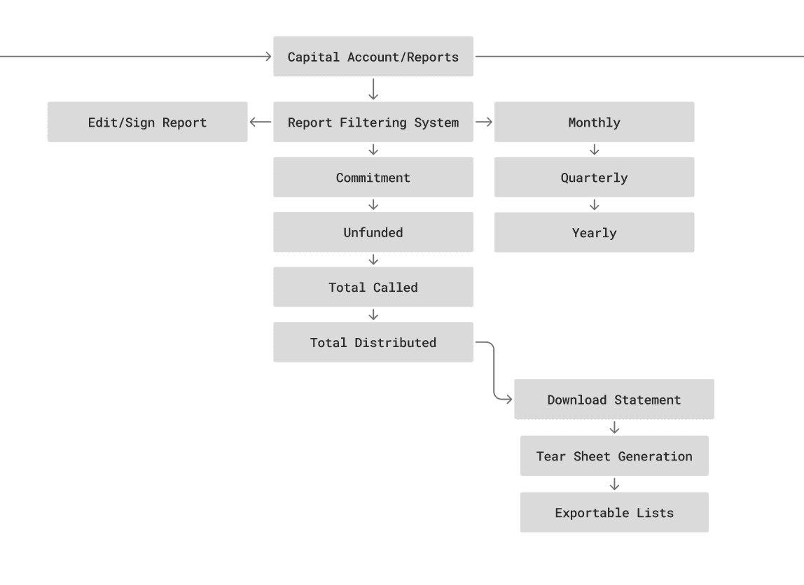 I designed the Capital Reports main page to surface key fund performance metrics through summary cards at the top of the page, while implementing filtering and search tools that allow users to quickly find and navigate individual reports.