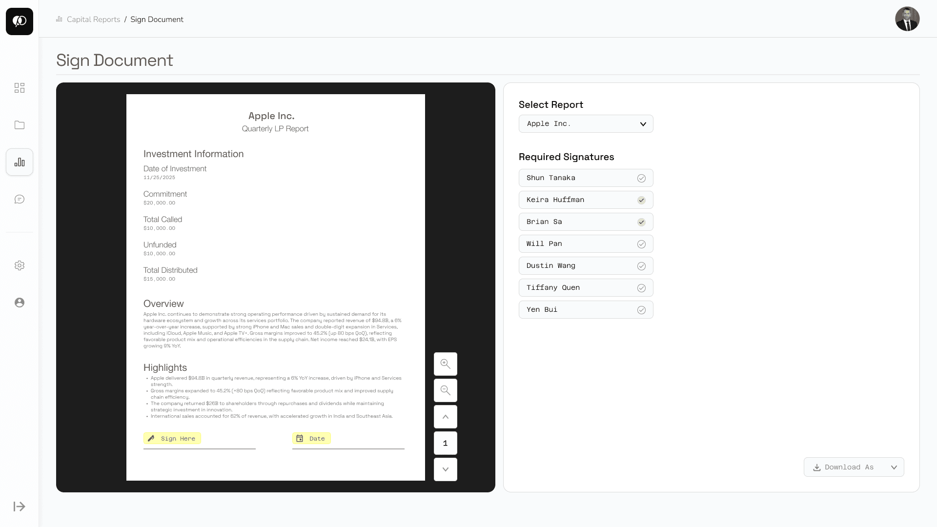 Users can also access a document signing page where LP investors can digitally sign reports, track the signing status of other stakeholders, and export the finalized document for distribution.