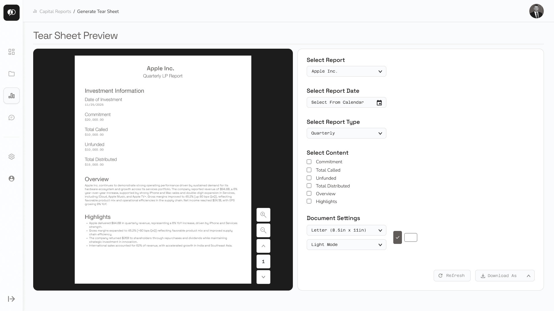From the main page, LP investors can select a specific report and generate a tear sheet; a concise report summary that can be easily exported and downloaded for external distribution.